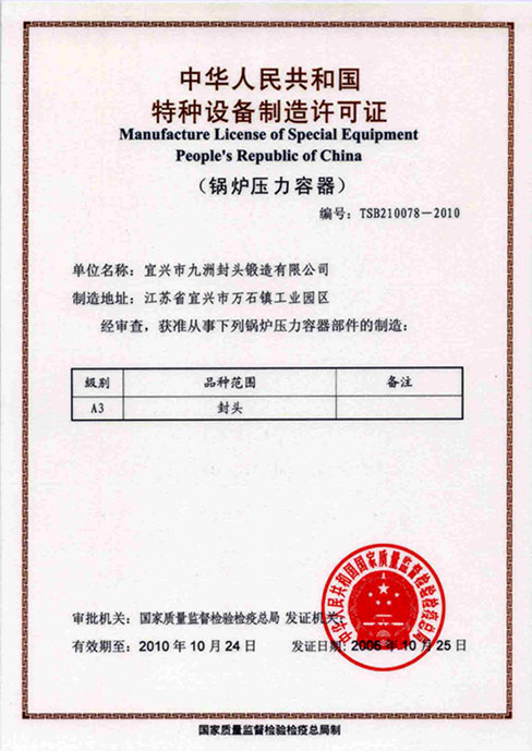 公司按國(guó)家標(biāo)準(zhǔn)建立了規(guī)范的產(chǎn)品質(zhì)量保證體系,先后通過(guò)了ISO9001:2008質(zhì)量體系認(rèn)證、ISO14001:2004環(huán)境體系認(rèn)證、OHSMS18001職業(yè)安全衛(wèi)生管理體系。2006年10月取得A3級(jí)鍋爐壓力容器部件生產(chǎn)許可證。2009年7月取得ASME 認(rèn)證。