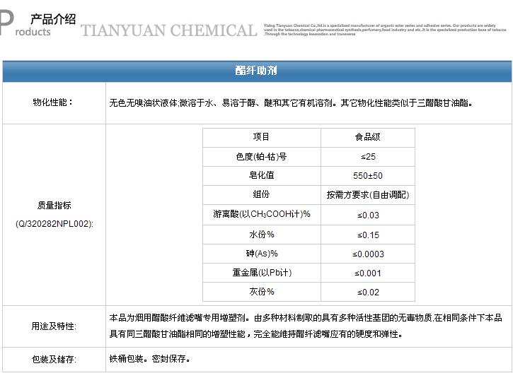 宜興市天源化工有限公司成立于1991年,是專業(yè)從事生產(chǎn)有機(jī)酯類化工產(chǎn)品及膠粘劑系列產(chǎn)品的實(shí)體企業(yè);產(chǎn)品廣泛用于煙草行業(yè)、化學(xué)醫(yī)藥合成、香料制造、食品加工及其它行業(yè);是國(guó)內(nèi)許多煙草廠商的專業(yè)定點(diǎn)生產(chǎn)基地。公司通過(guò)技術(shù)改造,橫向聯(lián)合等途徑得到迅發(fā)展,規(guī)模不斷擴(kuò)大,并多次被評(píng)為AAA級(jí)資信企業(yè)。生產(chǎn)的煙草配套材料系列產(chǎn)品和化工產(chǎn)品銷往全國(guó) 29個(gè)省、市、自治區(qū)。公司在全國(guó)煙草界享有較高的聲譽(yù)。