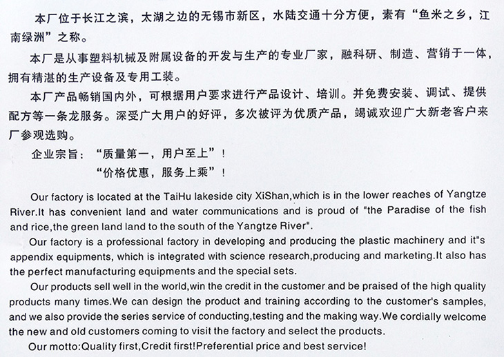 無(wú)錫市新區(qū)坊前萬(wàn)祥塑料機(jī)械廠座落在風(fēng)景秀麗的太湖之濱江南名城——無(wú)錫,已有20多年歷史。工裝設(shè)備齊全,技術(shù)力量雄厚。主要生產(chǎn)SJ-系列成套塑料機(jī)械,產(chǎn)品質(zhì)量獲省標(biāo)準(zhǔn)局執(zhí)行標(biāo)準(zhǔn)證書(shū)。| 在本機(jī)上配置各種型式的模具及輔機(jī)設(shè)備,能生產(chǎn)各種不同的產(chǎn)品。如橡塑嵌條,各種規(guī)格的塑料管材,塑料母料、電纜、電線、編織絲、包裝塑料帶、塑料袋、農(nóng)用膜、塑料容器、塑料裝飾品、塑料汽車(chē)地板等待。|