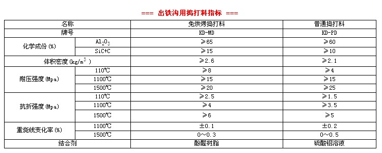 出鐵溝用搗打料指標(biāo)