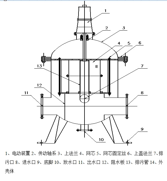1、電動(dòng)裝置2、傳動(dòng)軸系3、上法蘭4、網(wǎng)芯5、網(wǎng)芯固定絲6、上蓋法蘭7、排污口8、進(jìn)水口9、底腳10、放水口11、出水口12、阻水板13、排污管14、外殼體