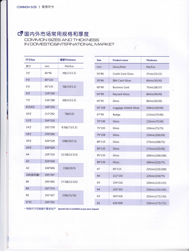 國內(nèi)外市場常用規(guī)格和厚度SIZES /
